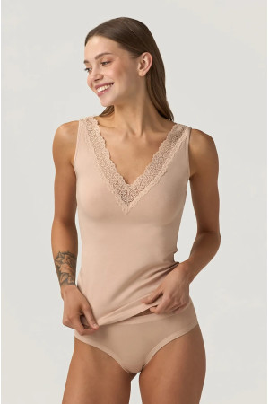 Майка женская из качественного хлопка на широких бретелях с V-образным вырезом, декорирована нежным кружевом в тон майки. Бренд: ELLEN.