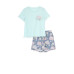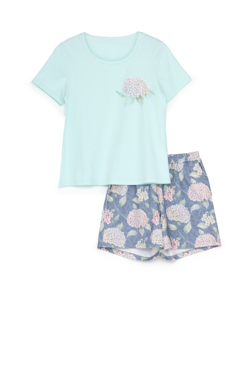 Комплект женский хлопковый футболка и шорты. Футболка мятного цвета с принтом гортензий и шорты с принтом гортензий. Коллекция от ТМ Ellen.